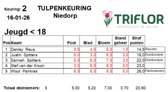 Ook de jeugdkeuring (<18 jaar) maakte deel uit van deze tweede ronde. Met een kleinere, maar fanatieke groep deelnemers liet de jeugd zien serieus mee te doen. De scores lieten zien dat er aandacht is voor kwaliteit en verzorging, met name op het gebied van bloem en blad. Een mooie en bemoedigende ontwikkeling voor de toekomst van de tulpenkeuring.