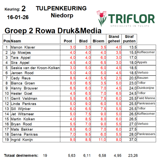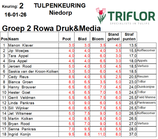 Afgelopen weekend vond in Niedorp de tweede tulpenkeuring plaats bij Triflor. Na de uitdagende eerste ronde stond ook deze keuring in het teken van vergelijken, scherp beoordelen en duidelijke kwaliteitsverschillen. De keurders kregen opnieuw een breed en divers aanbod voorgeschoteld, wat zorgde voor een interessante en soms lastige beoordeling.