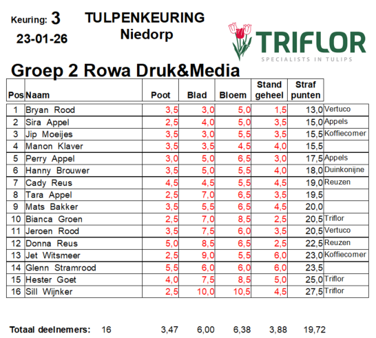 Ook in groep 2 was sprake van een stabiel en herkenbaar beeld. De strafpunten lagen dichter bij elkaar en lieten zien dat de deelnemers het juryoordeel steeds beter weten te benaderen, al blijven met name bloem en stand onderdelen waarin kleine verschillen grote gevolgen kunnen hebben.