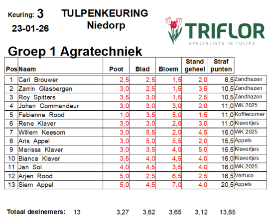 Keuring 3 liet duidelijk zien dat het keuren steeds scherper wordt. Voor het eerst dit seizoen wist een deelnemer onder de 10 strafpunten te blijven, wat aangeeft dat het jurybeeld zeer nauwkeurig werd benaderd. Ook breder in de uitslag was vooruitgang zichtbaar. In groep 1 bleven maar liefst twaalf deelnemers onder de 20 strafpunten, een duidelijk teken dat het inzicht in het gewas en de beoordeling per onderdeel beter begint te landen.